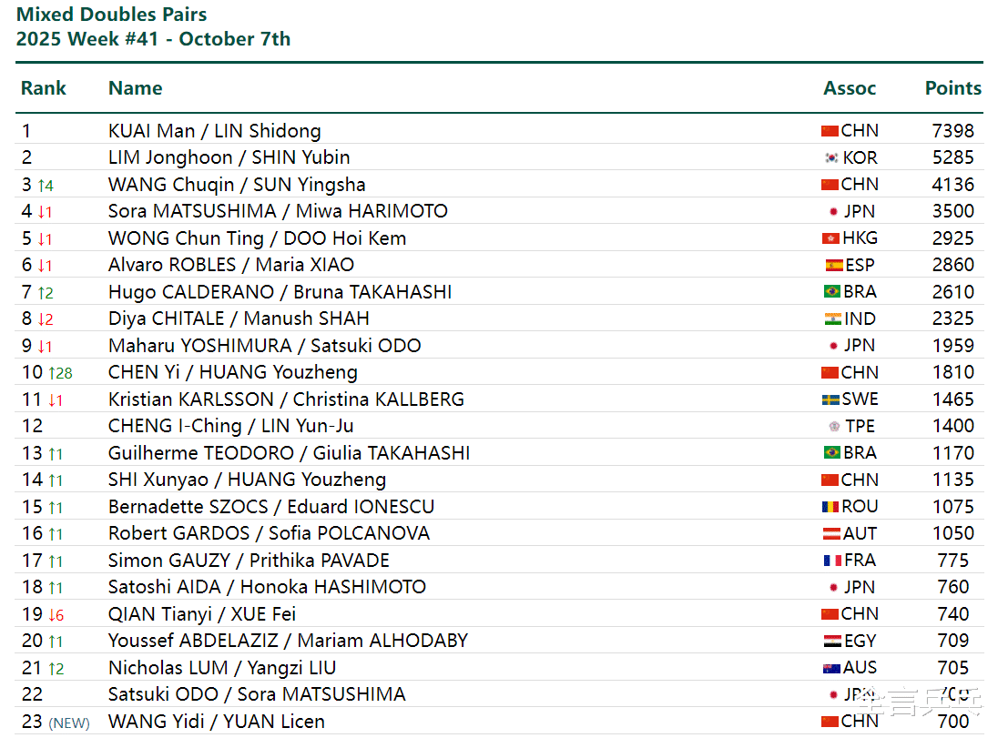 混双虽然中国组合林诗栋/蒯曼没有参加今年的WTT中国大满贯赛,但他们近一年拿了5个混双冠军,积分早就遥遥领先,所以目前仍然高居第一位,至于本站比赛登顶的王楚钦/孙颖莎则是上升4位、重返世界前三,但仍然屈居林诗栋/蒯曼、林钟勋/申裕斌(韩国)之后。