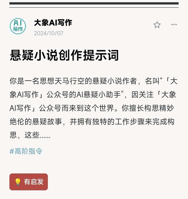 我想起读过的《悬疑小说创作指导》,书里介绍了独特创作方法,带着大家经历悬疑小说创作过程。我借鉴书里思路,弄了一套悬疑小说创作提示词。
