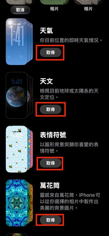 iOS 26.4 再度调整桌布设定介面,不同主题桌布改以条列式呈现,并附有简短说明文字。这些主题桌布并非预装于系统内,用户须点击「取得」才会下载至手机。已下载的桌布可点击旁边「Tick」移除,有助节省储存空间。