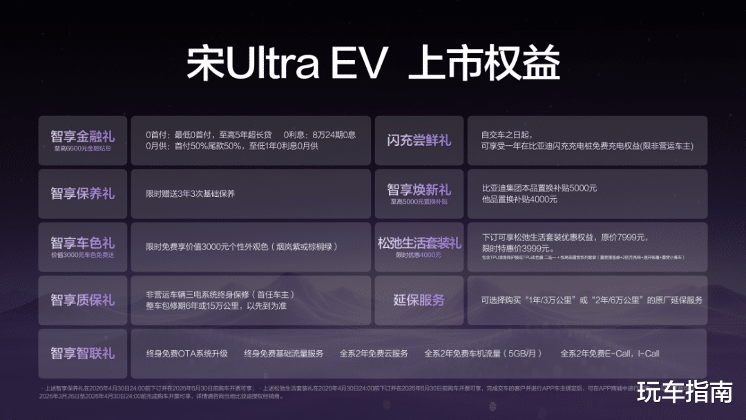 比亚迪王朝正在构建一个从购车、用车、到养车的全链路无忧体系。为此,宋Ultra EV带来了“0元购、0元用、0元养”的超重磅购车权益!同时还有其他丰富权益,为用户带来超值购车体验。