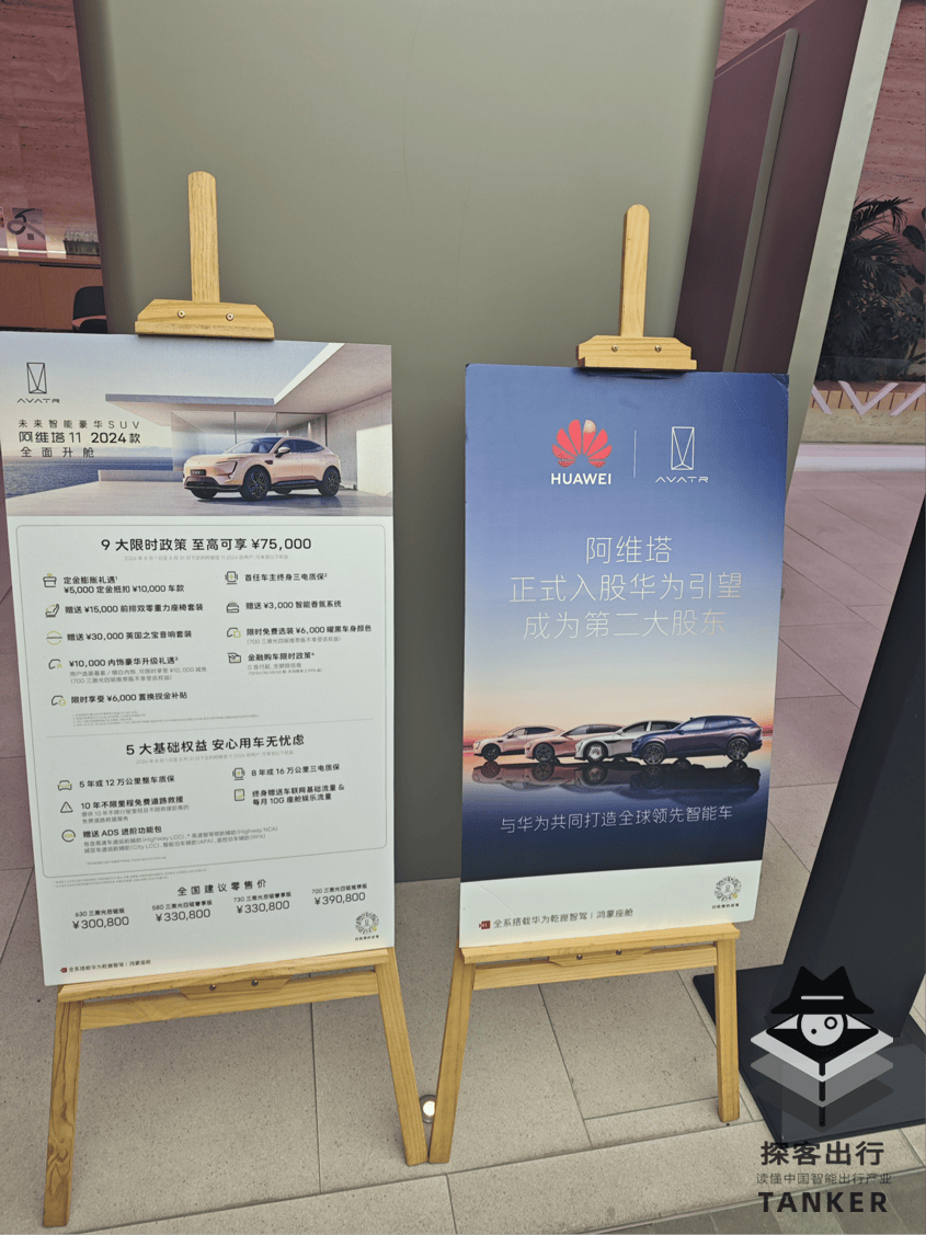但即便空间有限,在展车右侧的展示区,“阿维塔正式入股华为引望成为第二大股东”的海报,仍是被放在了显眼位置,以彰显全系搭载华为乾崑智驾、与华为合作的实力。