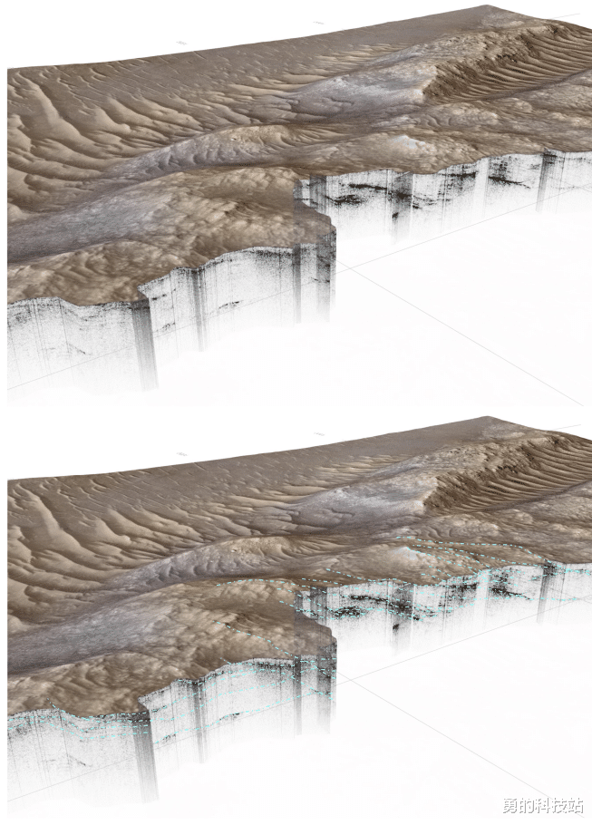 在边缘单元中,强烈反射且表面较暗的岩层和弱反射的岩性呈现为光。投影雷达图与HiRISE数字高程模型数据一起显示,并从地下描绘层(青色虚线)到对应的地表地形特征。图片来源:NASA/JPL/UCLA/UIO/ETH 苏黎世