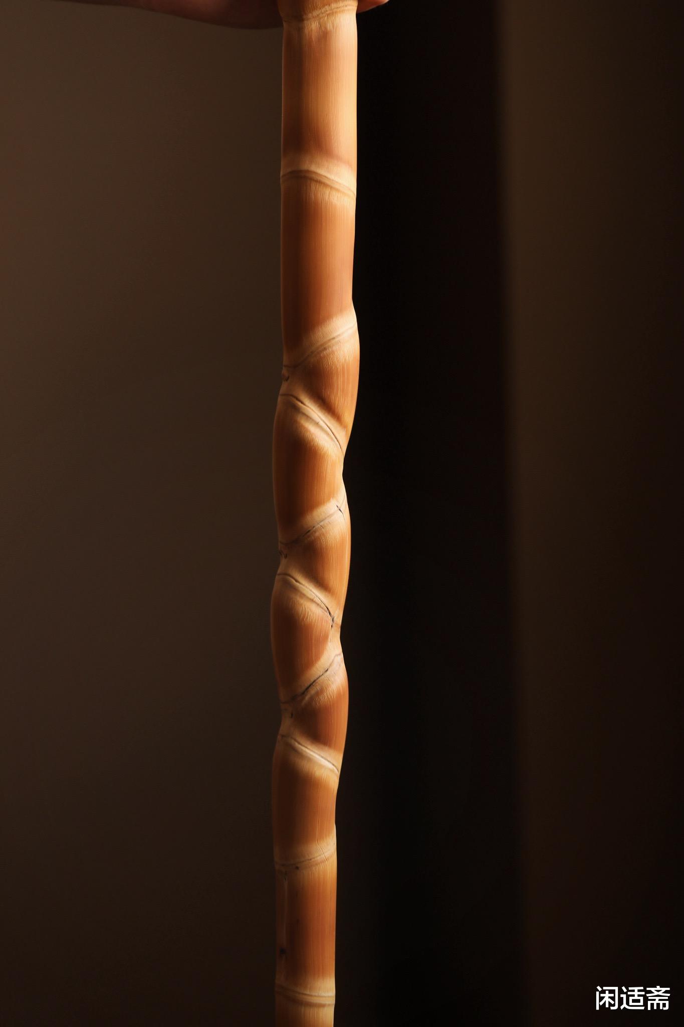其材质硬度高,即便长期倚靠也不易变形;且韧性强,可应对轻微碰撞而不易折;通体保留天然竹节的原始形态,凸显竹子的生长肌理,去除粗糙竹皮后反复打磨至细腻光滑,既无漆无蜡遮盖竹材本真的浅黄色泽与温润光泽,又让杖身触感如抚凝脂,握于手中不硌不滑,完美贴合手掌曲线,久持亦无不适感。