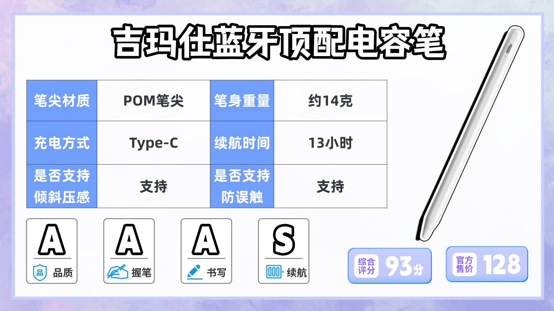 电容笔一天用下来,能否保持手部不疲劳很关键。重量控制在 11–15 克之间的产品相对更适合日常使用,既不会太轻导致飘,又不会太重造成手腕压力。笔身造型也要看是否顺手,握起来是否稳,不滑、不顶手才算合格。