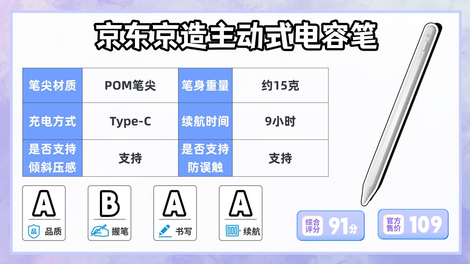 这款电容笔采用了航空铝合金材质,表面触感细腻,而且其笔身粗细适中,重量仅约13.7g,整体的握持感轻盈,长时间使用也不会有明显负担。同时它的笔尖为可更换的POM材质,耐磨性较好,书写小字时依然保持精准。并且它还支持倾斜压感,线条粗细可随角度变化,适合日常书写与轻度绘画。另外充电方面,它采用Type-C接口,续航约9小时,还算不错。只是它充满电大约需要90分钟,这个充电速度略慢。因此建议每次使用完毕,及时检查电量并及时充电,以便耽误下次的使用!