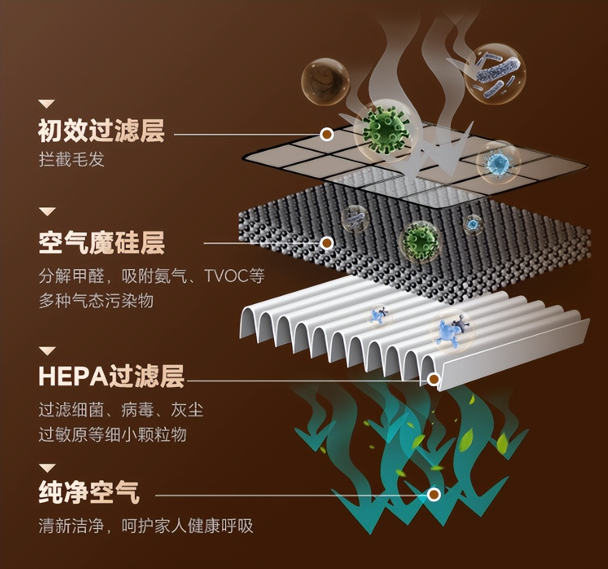 实测数据最有说服力:其甲醛 CADR 值高达 618.3m³/h,1 分钟能净化 10.31m³ 污染空气,35㎡密闭客厅(刚装定制柜)初始甲醛 0.23mg/m³,开强净模式 40 分钟就跌破 0.05mg/m³,去除率达 99.1%。关键是它用的 “空气魔硅” 分解技术,不是活性炭 “吸附赌命”—— 纳米多孔硅比表面积是活性炭 300 倍,能牢牢抓牢甲醛,再通过催化层拆成水和二氧化碳,从根源杜绝饱和反弹。CMA 检测显示,累计去除 1500mg 甲醛后性能仅衰减 4.3%,滤芯寿命长达 8 个月,是普通活性炭的 3 倍。