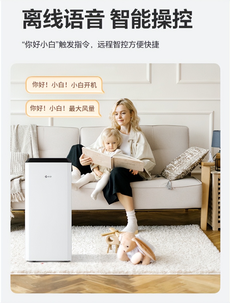 大户型家庭人口多,操作必须简单。老人不用学 APP,喊 “你好小白,小白开机” 就能响应,断网也能用;上班族可以通过 APP 远程开机,下班路上提前净化,到家就能呼吸清新空气。机身显示屏能实时看甲醛、PM2.5、湿度数据,红色预警绿色达标,一眼看懂空气状况,不用再瞎猜净化效果。