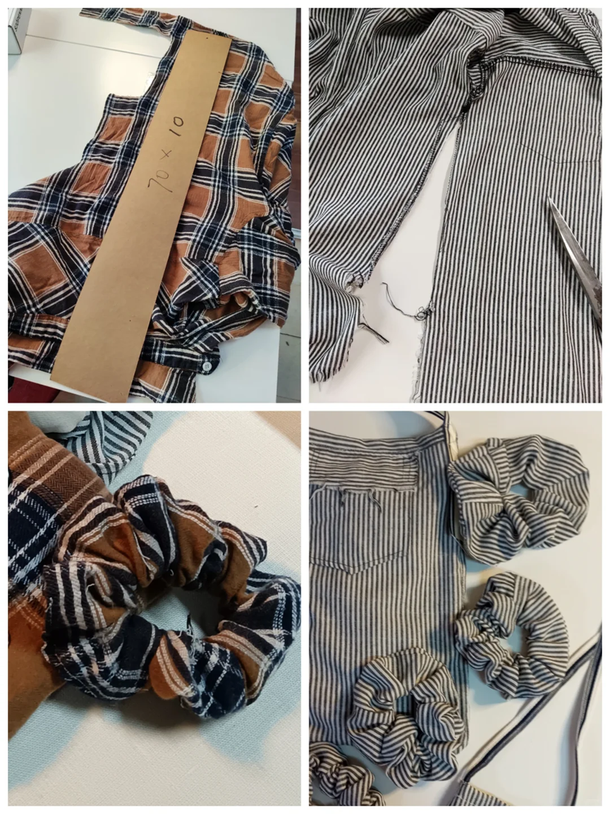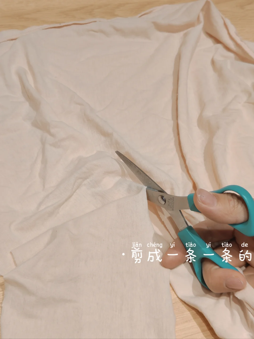 大家只需要对旧衬衫进行一下简单的裁剪,一般来讲,普通的发圈尺寸大概是70×10,大家可以按照这个尺寸进行裁剪。