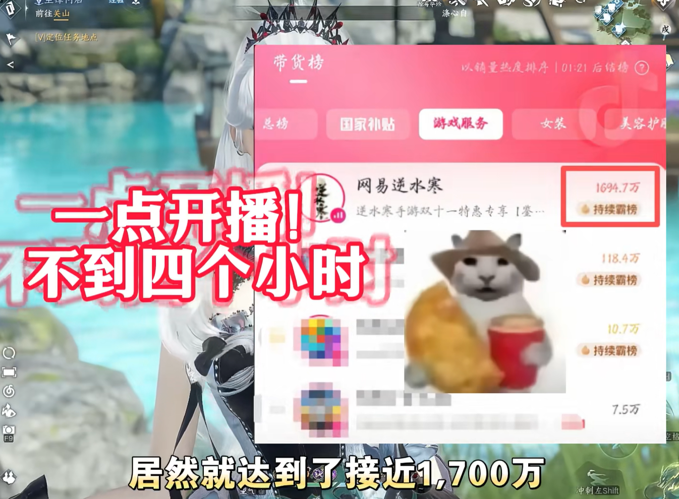 传统直播带货多聚焦实体商品,背后牵动着生产、仓储、物流等一整套复杂产业链条。然而,今年双11,直播带货赛道迎来颠覆性“新玩家”,一个潜在的万亿赛道正悄然成型——网易旗下《逆水寒》手游。其双11直播专场开播仅1小时,销售额便突破1700万元,直接登顶抖音带货总榜首位。