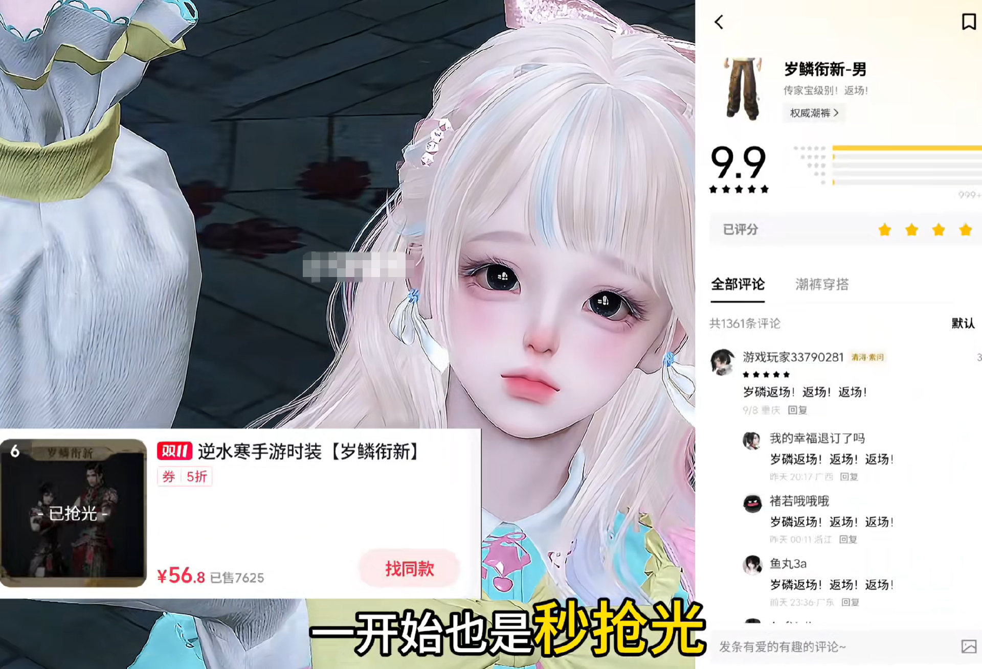 官方上架的时装同样抢手,多款返场热门时装及裤子一经上线便被秒空,其中《逆水寒》手游热门裤子“岁鳞衔新”售价56.8元,首轮库存售罄后,补仓才满足部分玩家需求。值得关注的是,这些虚拟商品无需原材料与生产加工成本,更无需承担物流配送与售后退换压力,近乎实现“纯利润”营收。