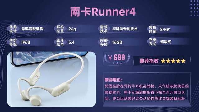 南卡Runner4是品牌深耕骨传导声学领域多年打造的专业机型,凭借出色综合体验,长期保持销量与口碑双领先,还斩获红点、缪斯、日本G-Mark等国际设计大奖,由游泳世界冠军傅园慧代言。品牌将高端技术下放至亲民价位,是大众认可度极高的骨传导耳机。