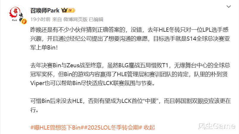 如果消息属实的话,那Bin哥差一点,就成为LCK赛区,首位“中援”选手了啊,当然,也不排除HLE,跟JDG一样,只是转会期的时候随便问一下,但就算是提一嘴,也打破LCK记录了,之前可没有听说,LCK有买LPL选手的想法,不过今年世界赛打完,HLE应该庆幸Bin没来,不然16强了。