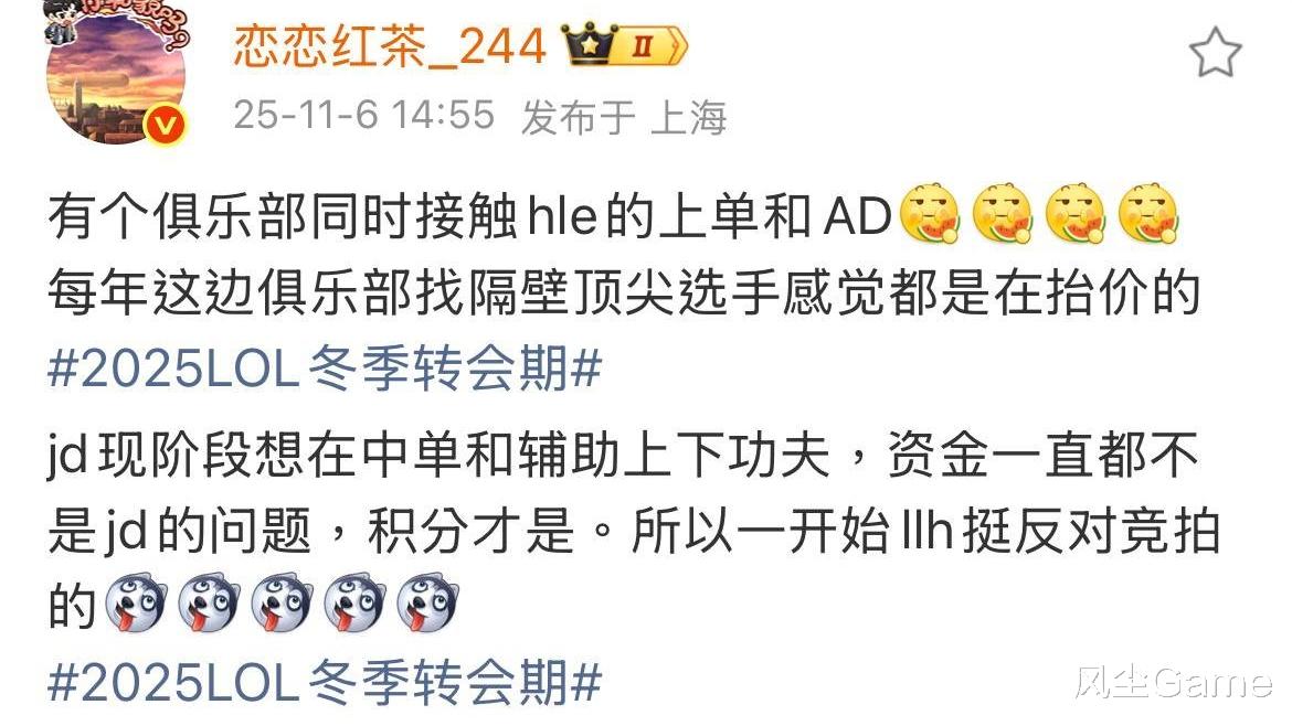 恋恋红茶爆料:有家俱乐部,正在同时接触HLE上单和AD,而且这支战队,每年都会找隔壁顶尖选手,最好韩援这一口的,非蓝莲花莫属,之前京东就被爆出过,接触Chovy、Zeus等人,所以基本上可以实锤了,但因为没有打进世界赛,京东的竞拍优先级比较低,可能有钱也花不出去。