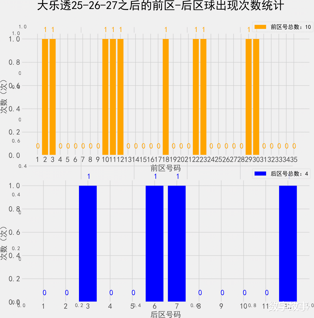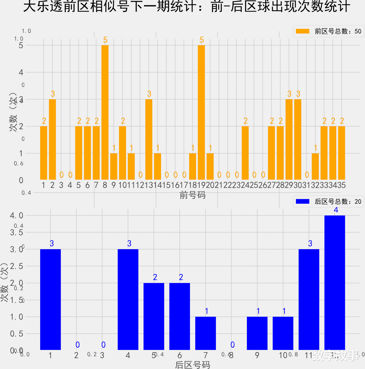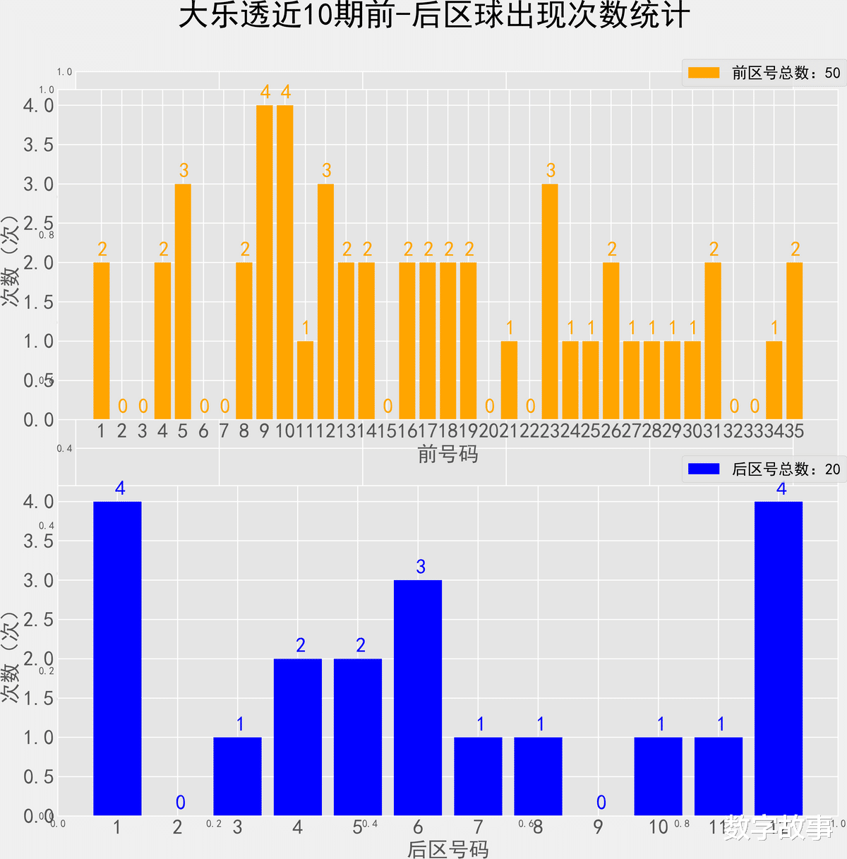 大乐透近10期前后区号统计情况统计样本数据: 50个前区号码 20个后区号码