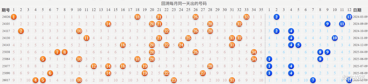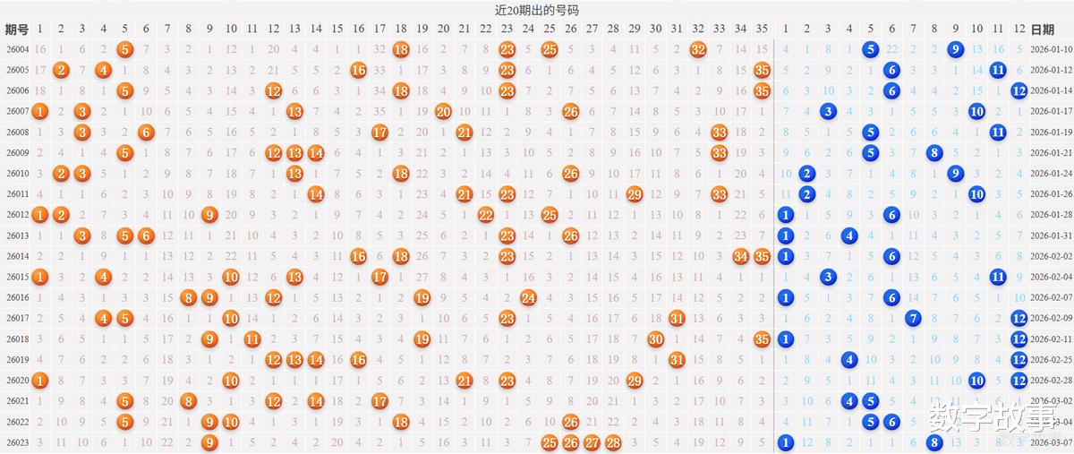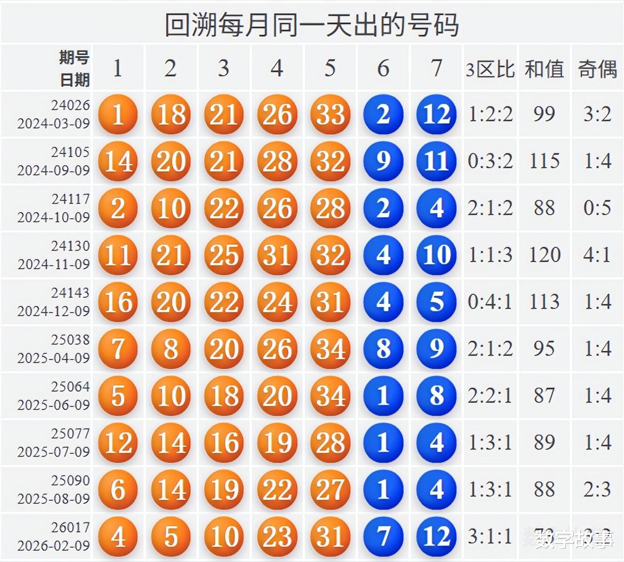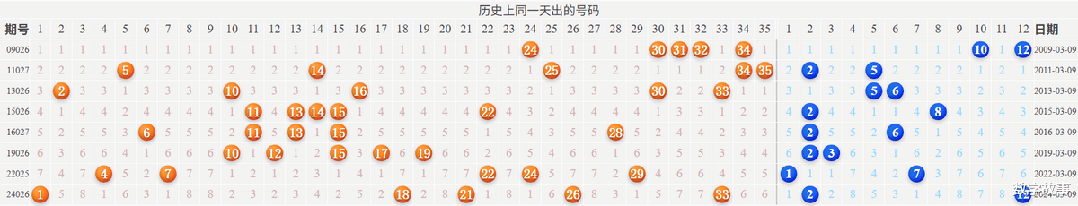 博弈心理,挑战概率: 看近期开奖号码,也可看历史数据统计!【大乐透26024期多角度冷热号】大乐透26024期四维走势图,前后区号统计及冷热号1) 历史同一天:03月09日 (共8期)