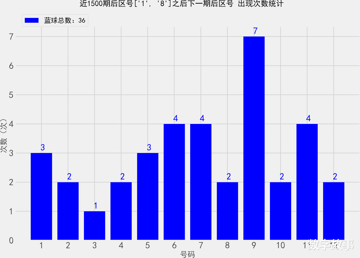 统计近1500期后区号1-8之后, 各后区号的出现次数大乐透26023期后区号是1-8找出近1500期后区1-8号之后,下一期出现的所有后区号,统计其出现次数。除开这一期,共出现了18次1-8后区号那么统计的样本数据是36个
