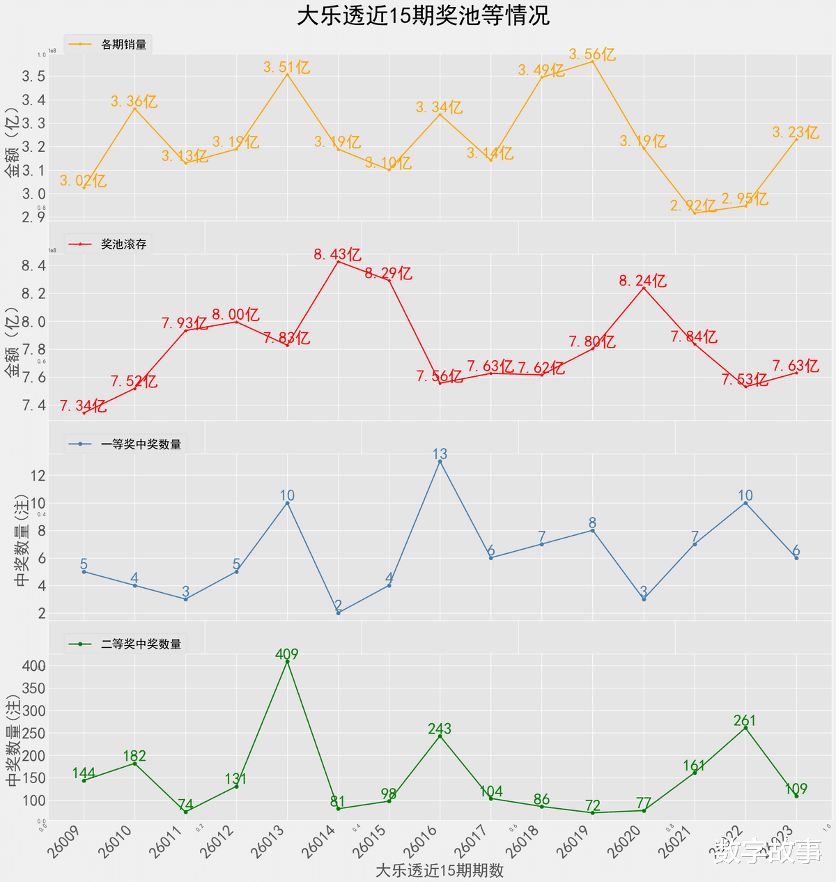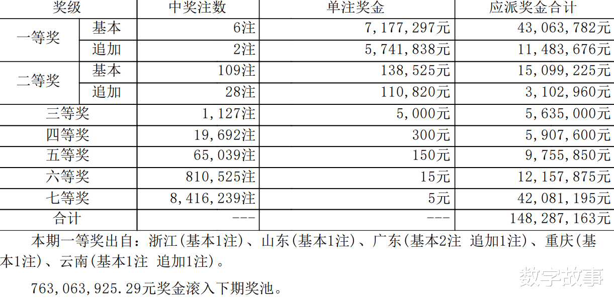 大乐透26023期一等奖:6注,追加: 2注二等奖:109注,追加: 28注。本期全国销售金额:3.230 亿 奖池滚存:7.631 亿.近15期奖池滚存, 中奖情况等信息: