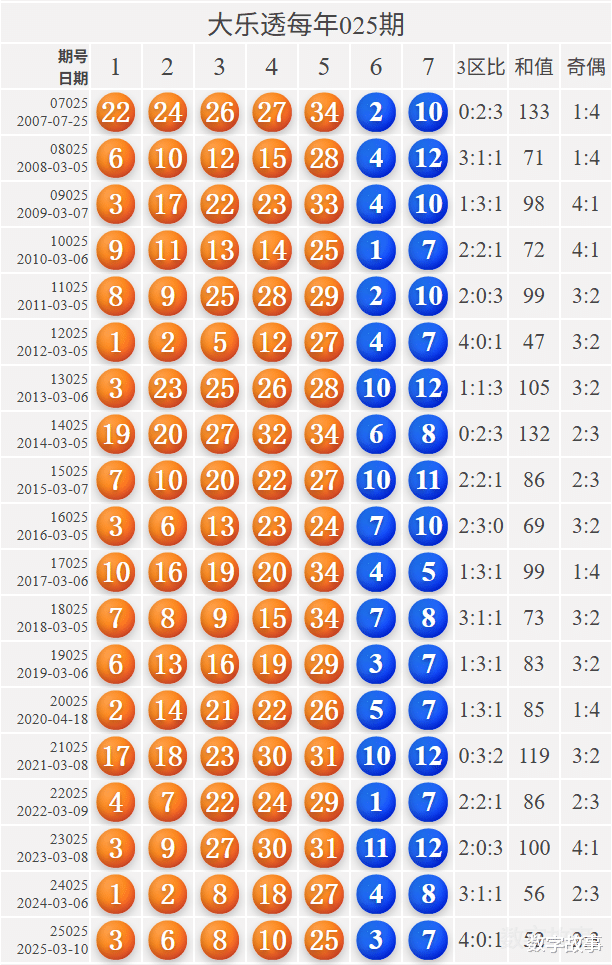 大乐透每年025期的出奖号