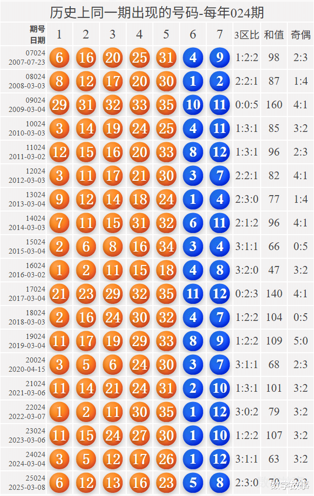2) 历史同一期: 每年024期 (共19期)
