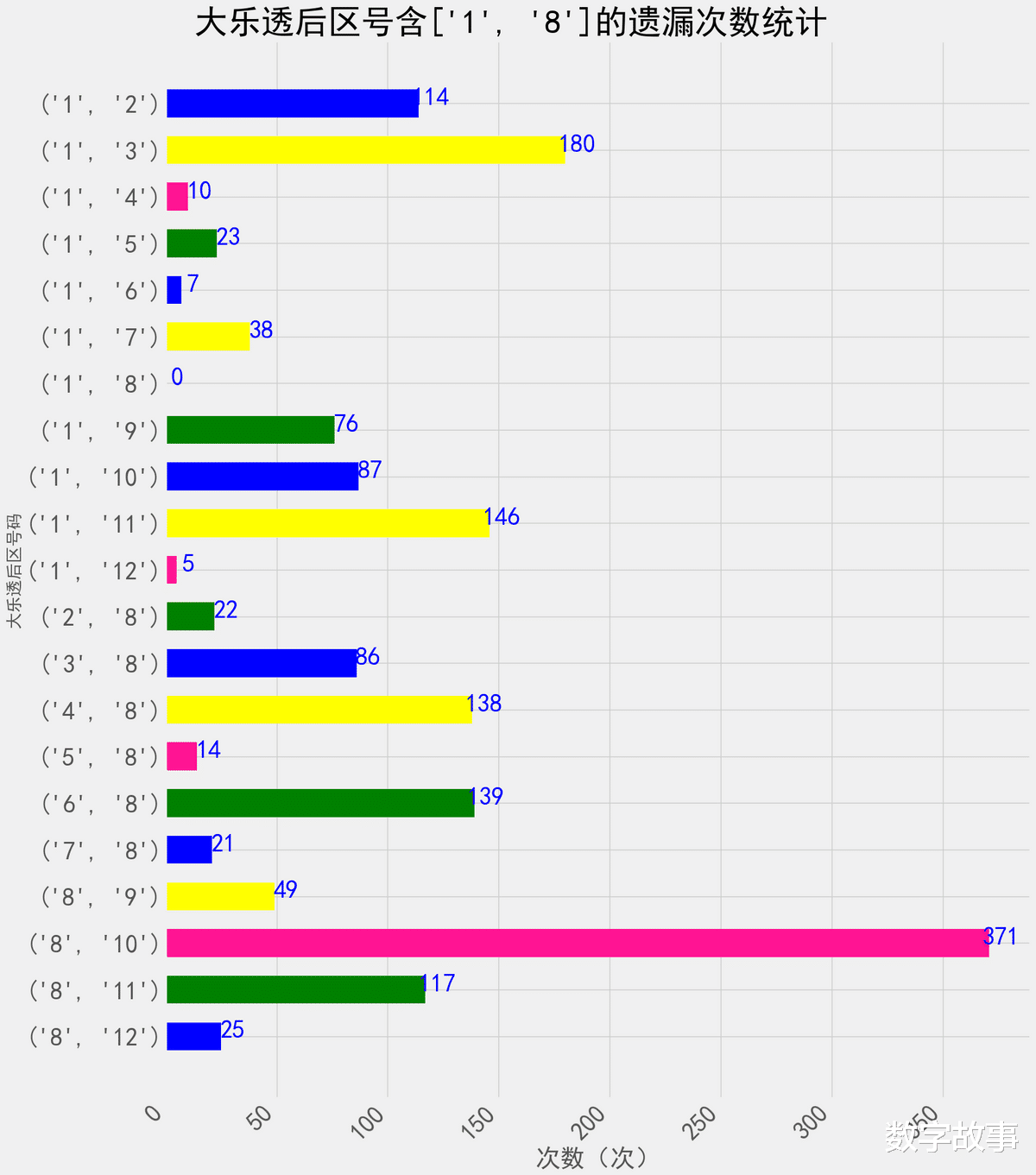 大乐透后区含1或8的双号遗漏次数统计大乐透后区组合1-8近150期出了3次,这次中断了90期遗漏。