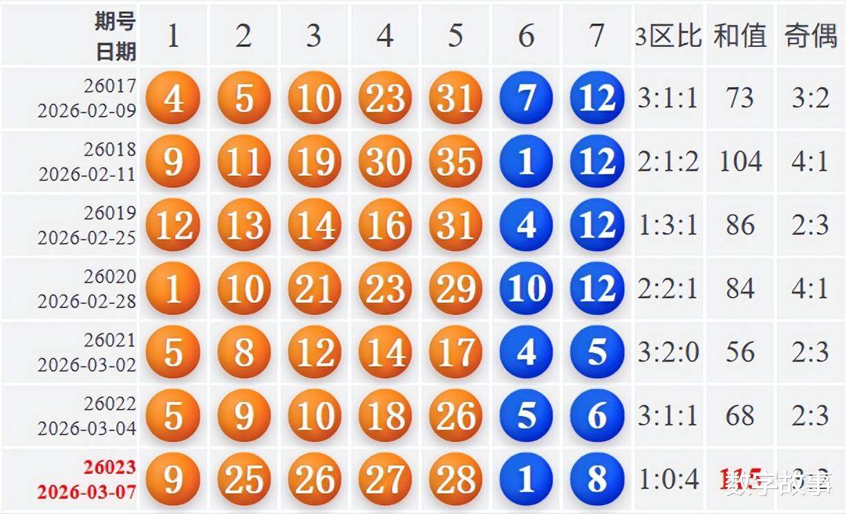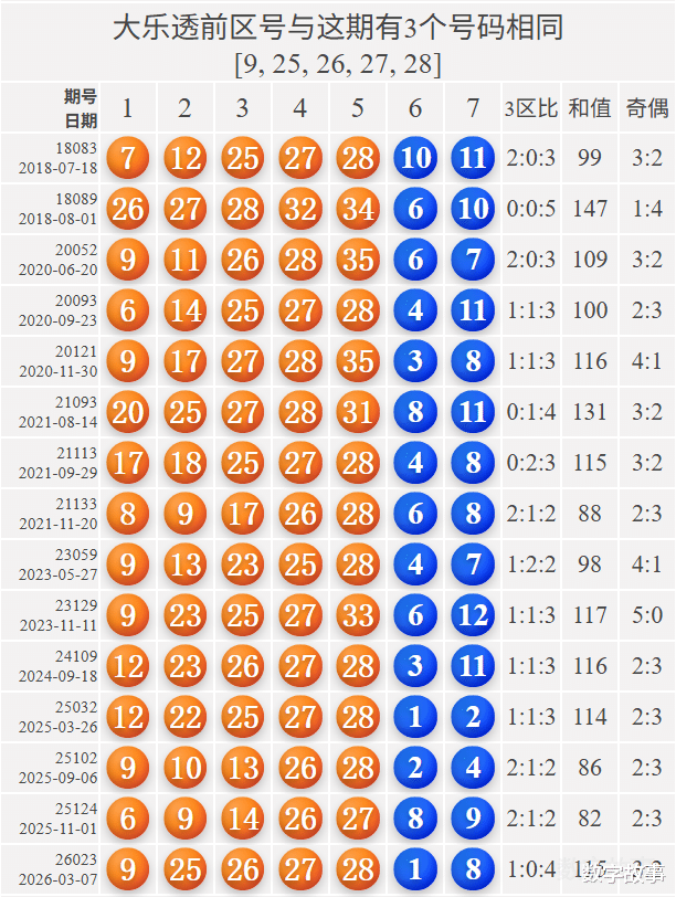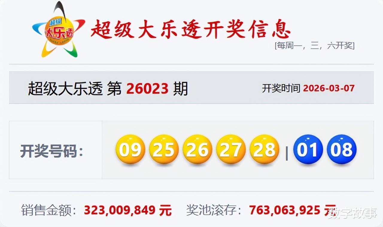 文末有大乐透前区号四连号25-26-27-28的历史统计。【体彩大乐透26023期开奖结果及统计】前区号和值115,后区1-8中断90期遗漏;6注一等奖,奖池7.631亿。大乐透26023期开奖结果及中奖情况:出奖时间: 2026-03-07 星期六 前区号:9-25-26-27-28后区号:1-8大乐透前区重号叠码:9, 26前区奇偶比:3:2 前区和值:115前区跨度:19 三区比:1:0:4连号: 25-26-27-28
