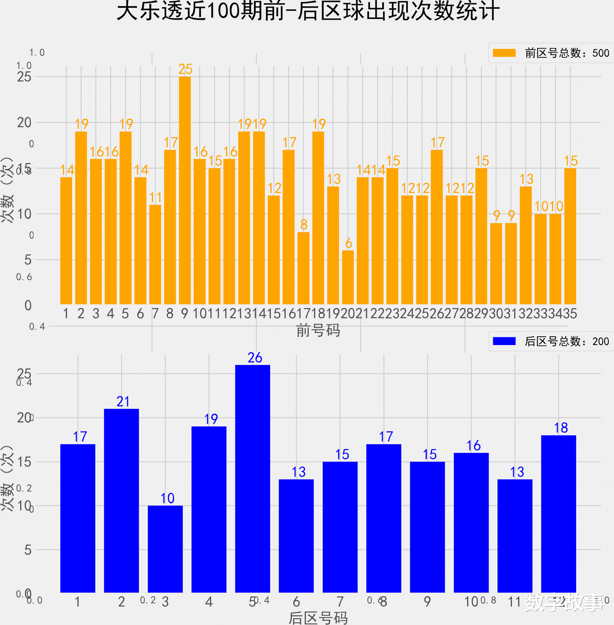 大乐透近100期前后区号统计情况统计样本数据: 500个前区号码 200个后区号码