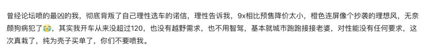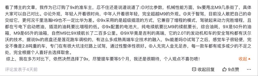 “我在多方面对比下,毅然决然选择了9X,尽管提车要等5个月,我还是很期待。”