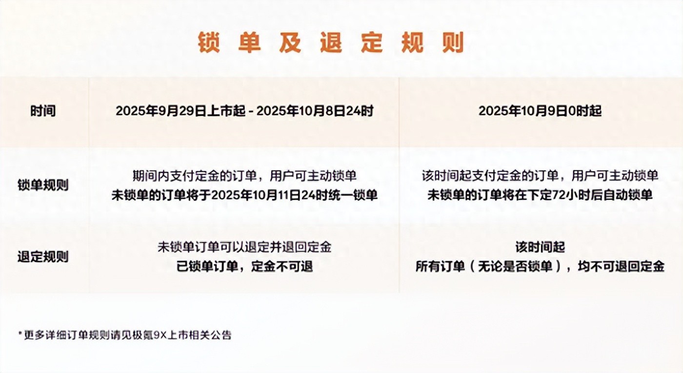 但热度之外,极氪这次也设置了一道“犹豫期”机制:从9月29日到10月8日24点,所有未锁单订单都可随时取消并全额退还2万元定金;10月9日起无法退款,10月11日系统将自动锁单。