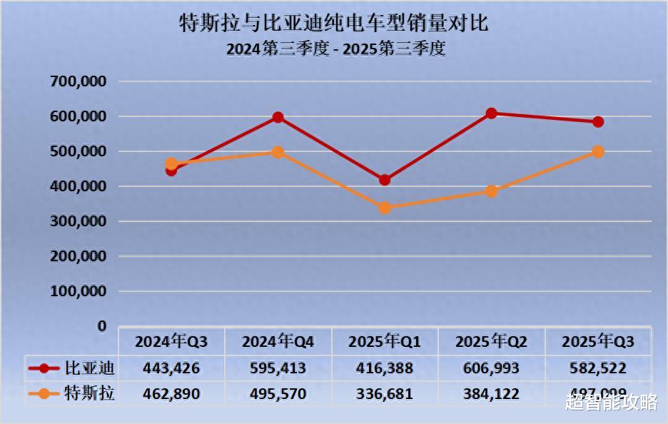 真没想到!2025年三季度,比亚迪纯电销量又赢了特斯拉,前者卖了582522辆,后者交付497099辆,单季领先8万多辆