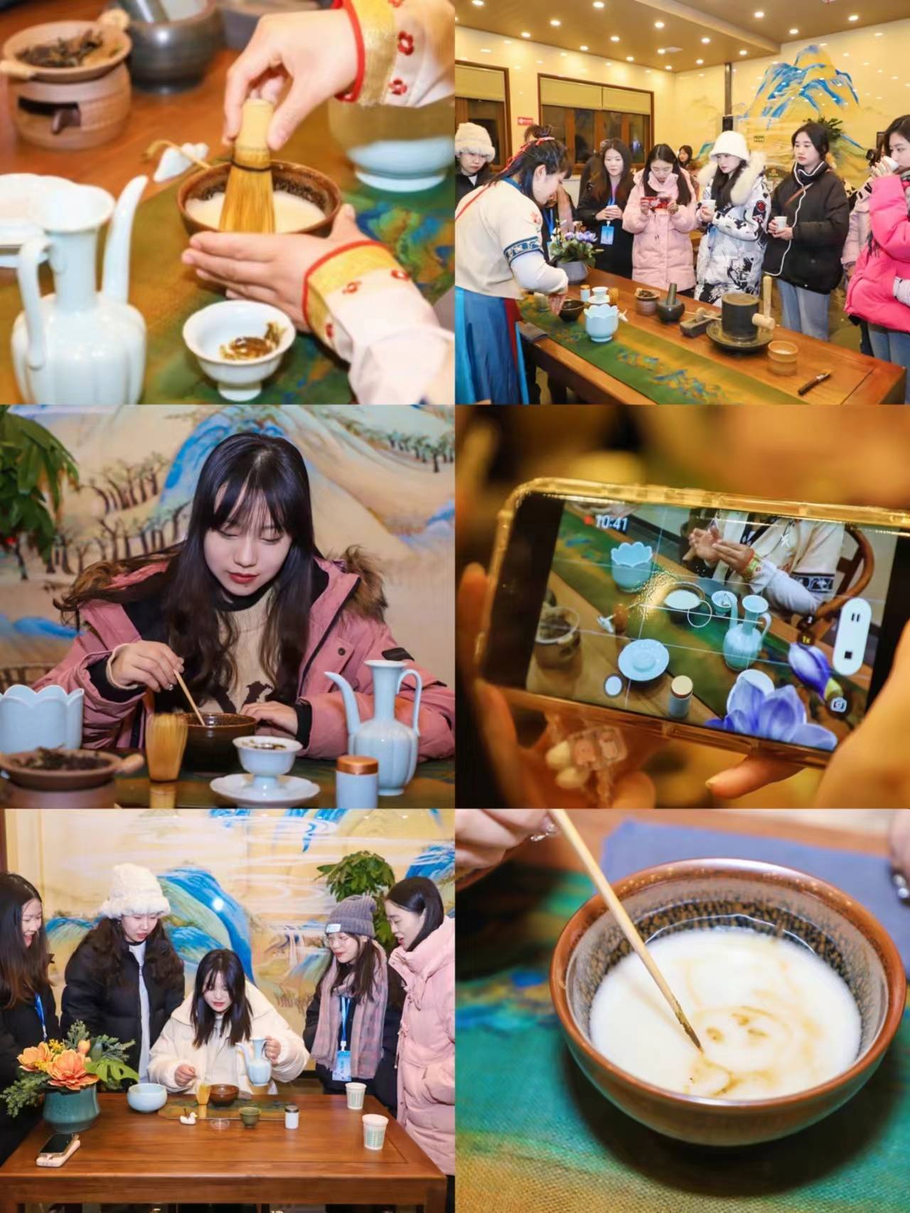 感受赏冰滑雪的浪漫与激情后,大学生网络达人们走进铜川花月荟非遗课堂,深入进行了宋氏点茶、耀瓷技艺等研学体验。作为宋代流行的一种吃茶方式,宋式点茶充满了生活的仪式感。备好一只汤瓶、一瓯建盏、一枝茶筅、一个茶勺,“体验官”们化身,跟着点茶师学习“七汤点茶法”,炙茶、碎茶、碾茶、罗茶、候汤、熠盏、注汤调膏、击拂...在缓慢的次序中感受茶艺的独特韵味,品尝饮茶的精致与典雅。