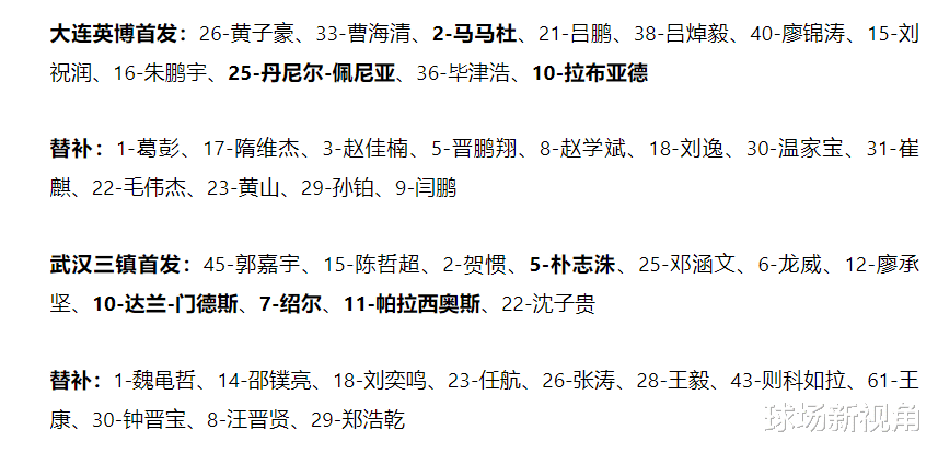 首发阵容:大连英博方面,李国旭派出三外援出战,其中,马莱莱、阿利米缺战,毕津浩、朱鹏宇首发主场,武汉三镇方面,邓卓翔派出四外援出战,图多列没有进入大名单,郑浩乾、钟晋宝替补席待命。