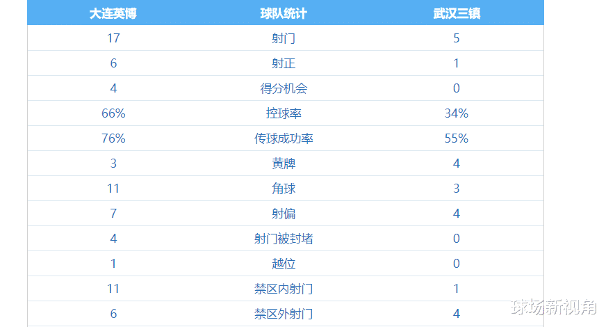 2、大连英博在本场比赛场面、数据方面均处于优势,尤其是在射门次数方面,是武汉三镇的三倍之多,但是却无法打进一球,可见,大连英博锋线球员把握机会能力太差。