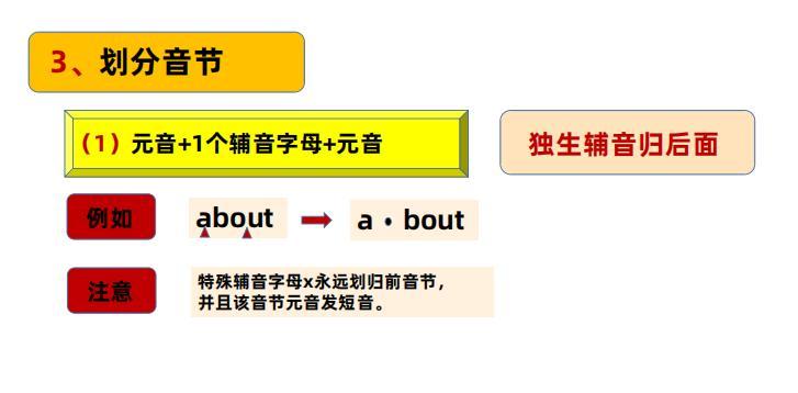 划分音节,找元音是关键,找到元音做好标记,核心思想就是看标记之间的辅音字母情况!