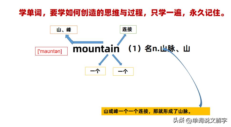 其实“mount峰、山”单词学会后,我们想创造“山脉”,大家只需要知道“山脉”其实是“山、峰”一个个连接形成的,就可以进行创造了!详细解说图如下: