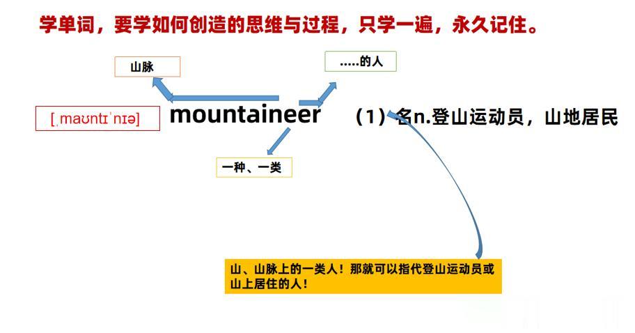 当然在学会“山脉mountain”后,在其后面加一个表示“一类人”的后缀“eer”,就可形成表示“山脉上的一类人”这样含义的单词“mountaineer”!“山脉上的一类人”不是“登山运动员”就是“山地居民”!因此“mountaineer”必然有两个含义!详细解说图如下: