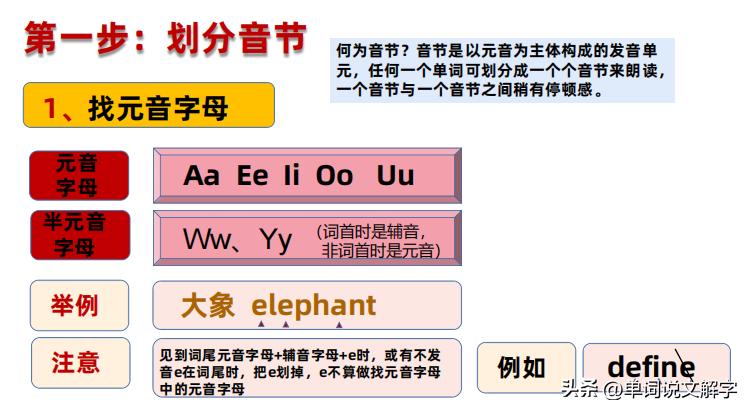 任何一个学生学英语时,必须要过单词这一关,学单词首先必须要学会音节划分!单词在发音时就是按照音节,一节一节发的!一节一节之间稍微有一点定顿感!上面我们已经分享了音节划分的找元音字母以及做标记等前期手段!接下来我们分享,在找到了元音字母,并且做好标记的前提下,如何来划分音节!