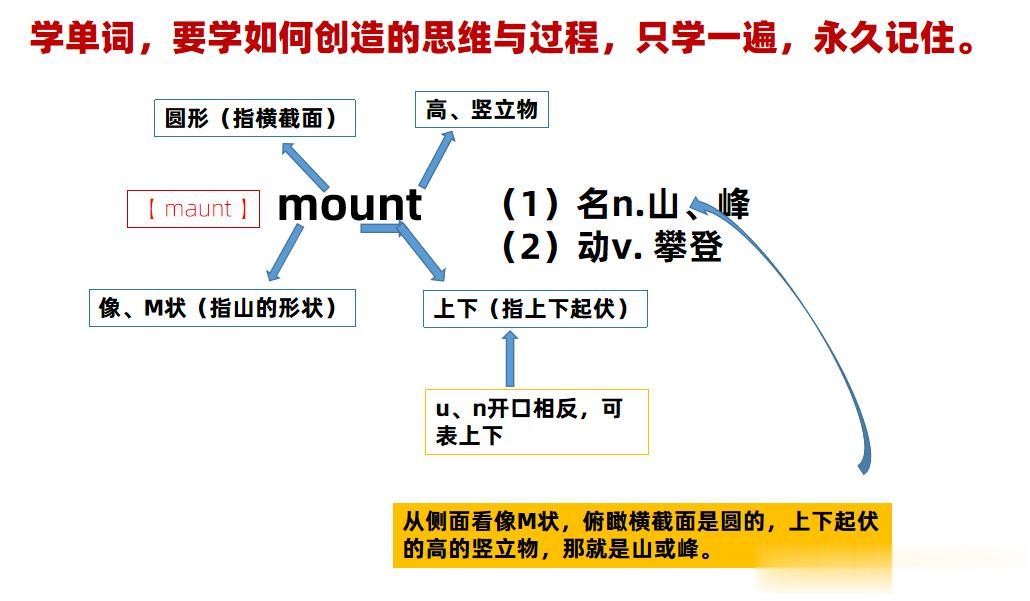 通过简单观察,大家应该会发现这组单词主要基于“mount”这个单词创造而来的,如果我们能够深刻理解与掌握“mount”为什么这样写,它到底可以表达哪些含义,那么我们就可以轻松将这组单词牢记,尤其“count 数数、计算总数”这个单词,许多人是找不到他与“mount”有什么底层逻辑关系!只是从外形上宏观的看到他们之间有点关系!只要大家认真阅读,你就会恍然大悟,然后将死记硬背方式扔的十万八千里远!