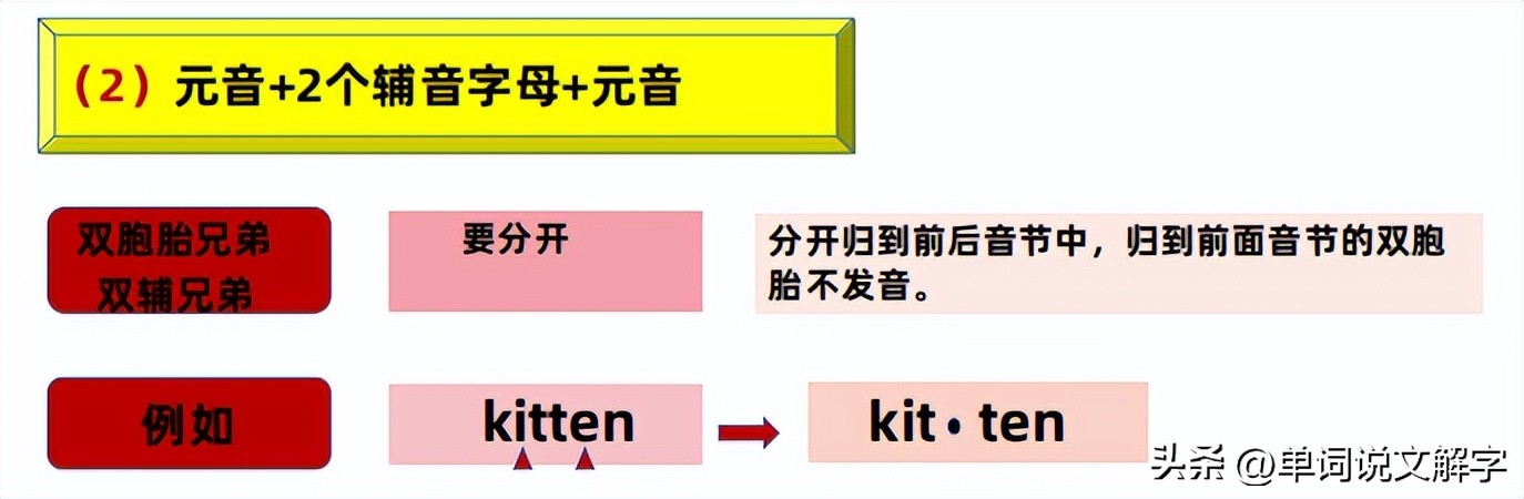 如果两个标记之间的辅音字母,既不是一个,也不是“难兄难弟”!那就将这两个辅音字母一前一后划拨给我们标记好的元音!如果这两个辅音字母是一样的,这种我们可以将其称为“双胞胎兄弟”,他是归属于一前一后划拨!只是划给前面的那个辅音双胞胎之一不发音!