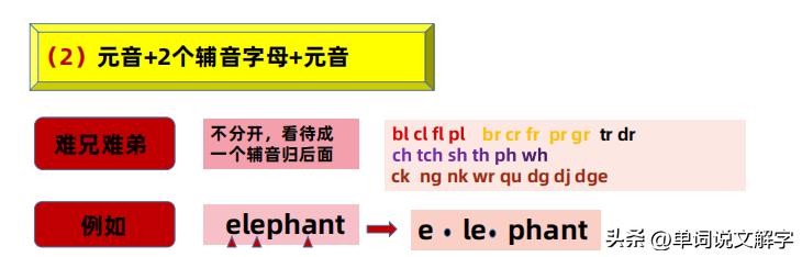 如果两个元音标记之间不是我们刚说的“只有一个辅音字母”,而是两个辅音字母!我们先看这两个辅音字母能不能看一个整体,看待成一个辅音字母,如果可以,我们就把这种能看待成一个整体的情况叫做“难兄难弟”,这些能看待成一个整体的“难兄难弟”是不能分开的,我们把他看待成一个辅音,关于为什么把他们看成一个辅音,想不明白的老师或家长,加我微信,我会给你解说!