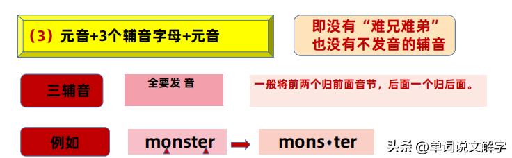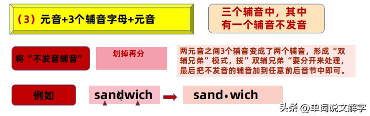 如果两个标记之间是三个辅音字母,我们的思想不变,依然是看里面有没有“难兄难弟”,如果有,我们就可以把三个转化成两个,按照一前一后划拨!如果没有就看有没有不发音的辅音字母,把它先划掉,就由三个变成两个!如果这些都没有,那就把三个中的前后两个先划拨给前后元音!详情请看解说图。