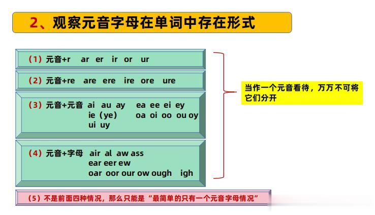 你见到任何一个单词时,从前往后找,当你找到第一个元音字母时,马上观察一下,这个元音字母后面有没有紧跟r字母形成ar、er、ir、or、ur形式或紧跟re字母形成are、ere、ore、ire、ure形式,或者你找到的元音字母有没有再紧跟一个元音字母形成ai、ay、au;ea、ee、ei、ey;ie、ye;oa、oi、oo、ou、oy形式,或者是元音字母后面跟了其他辅音字母形成这样的组合air、al、aw、ass、ear、eer、ew、oar、oor、our、ow、ough、igh!如果出现这四种情况,把这些看待成一个整体!当做一个元音!在他们的下面做好标记,如一个小三角形或圆圈或圆点!如果没有出现上面所说的四种情况!直接在找到的元音字母下面做标记!关于为什么上面四种情况要看成一个整体,当做一个元音,想不明白的老师或家长可以加我微信问我,我会给大家解答。