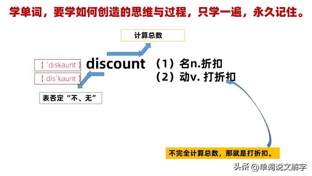 当然我们也可利用“count计算总数”来创造“打折扣、折扣”这个词!“打折扣”就是“不完全计算总数”!详细解说图如下: