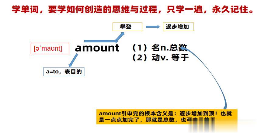 大家在学习“mount”时,一定注意引申出来的动词“攀登”这个含义!“攀登”有可根据攀登的性质引申出“逐步增加”含义!然后我们可以利用“逐步增加”这个含义创造“总数、等于”这个单词!详细解说图如下:
