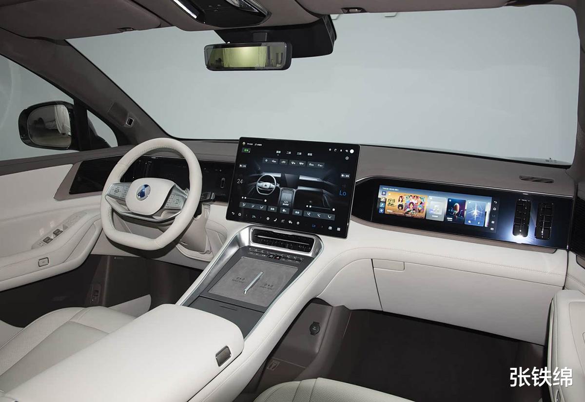 中控台采用对称式布局,内嵌式的液晶仪表和副驾屏尺寸为13.2英寸,中间是悬浮式的17.3英寸中控屏,高配版还提供了50英寸AR-HUD抬头显示系统。双辐式方向盘造型很别致,使用了怀挡式换挡机构。副仪表台使用了立体式设计,上部提供双了50瓦手机无线充电面板以及带盖板的杯托等,扶手箱内配备了容积为11L的冷暖冰箱,副驾还会提供零重力座椅,带有电动腿托。