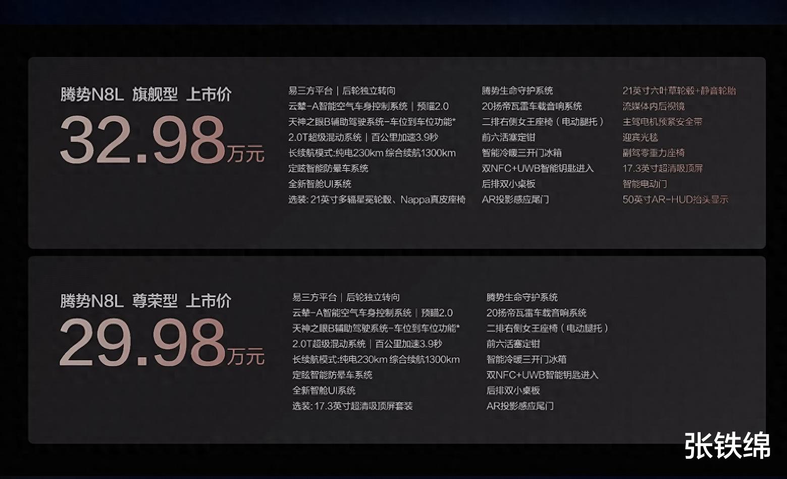 在腾势N9之后,腾势品牌的又一款大型插电混动SUV,腾势N8L正式上市,新车共有两款配置,价格分别为29.98和32.98万元,相比此前的预售价进行了下探,起步价进入了30万以内的区间。作为一辆豪华品牌6座大型插混SUV,这个价格还是很有吸引力的,而且其整体的配置也是很抢眼的,下面来详细看一下。
