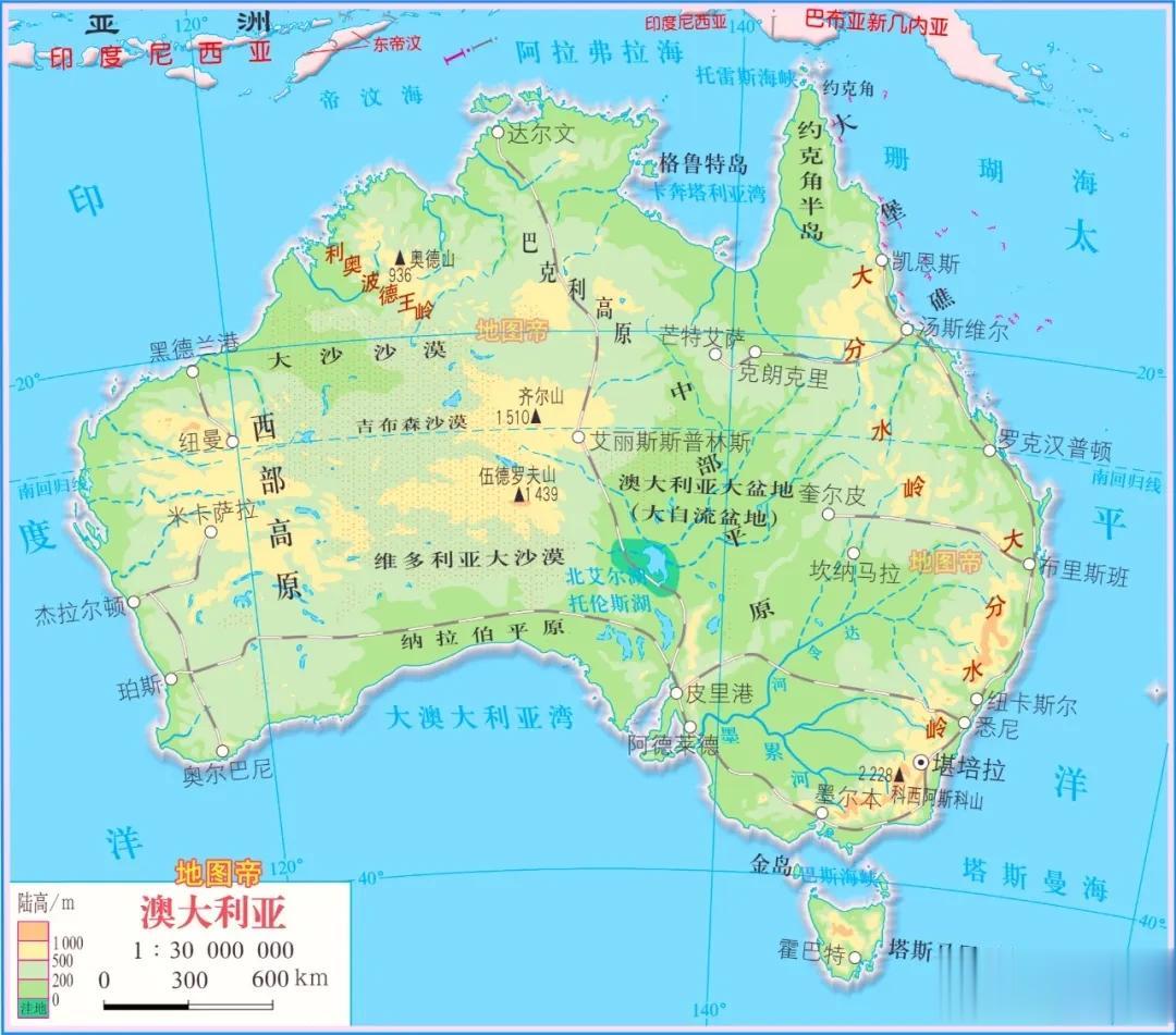 澳大利亚地处南太平洋和印度洋之间,由澳大利亚大陆、塔斯马尼亚岛等岛屿及海外领土组成,面积约768.82万平方千米,居世界第六,约为中国八成大小。