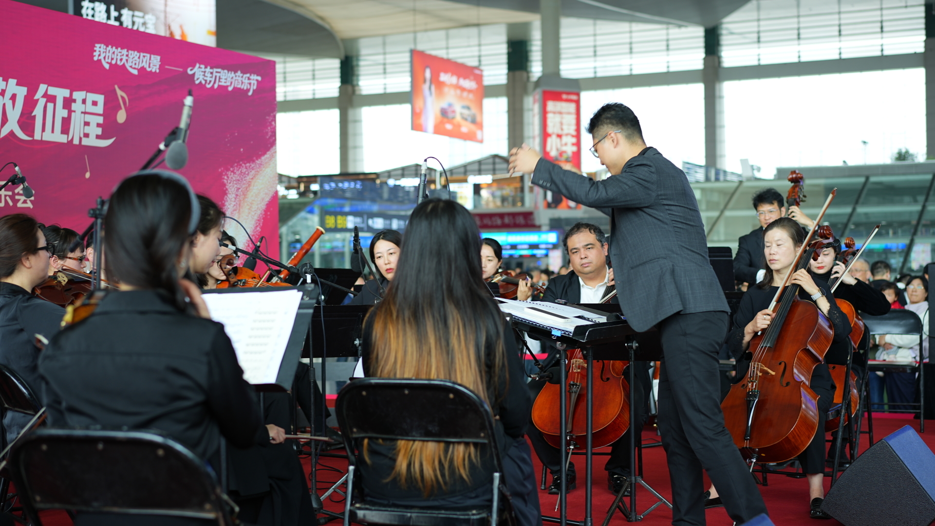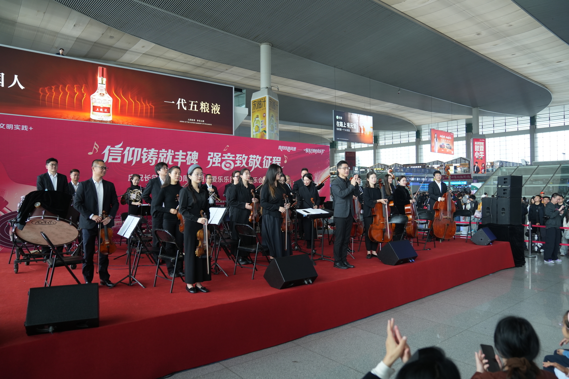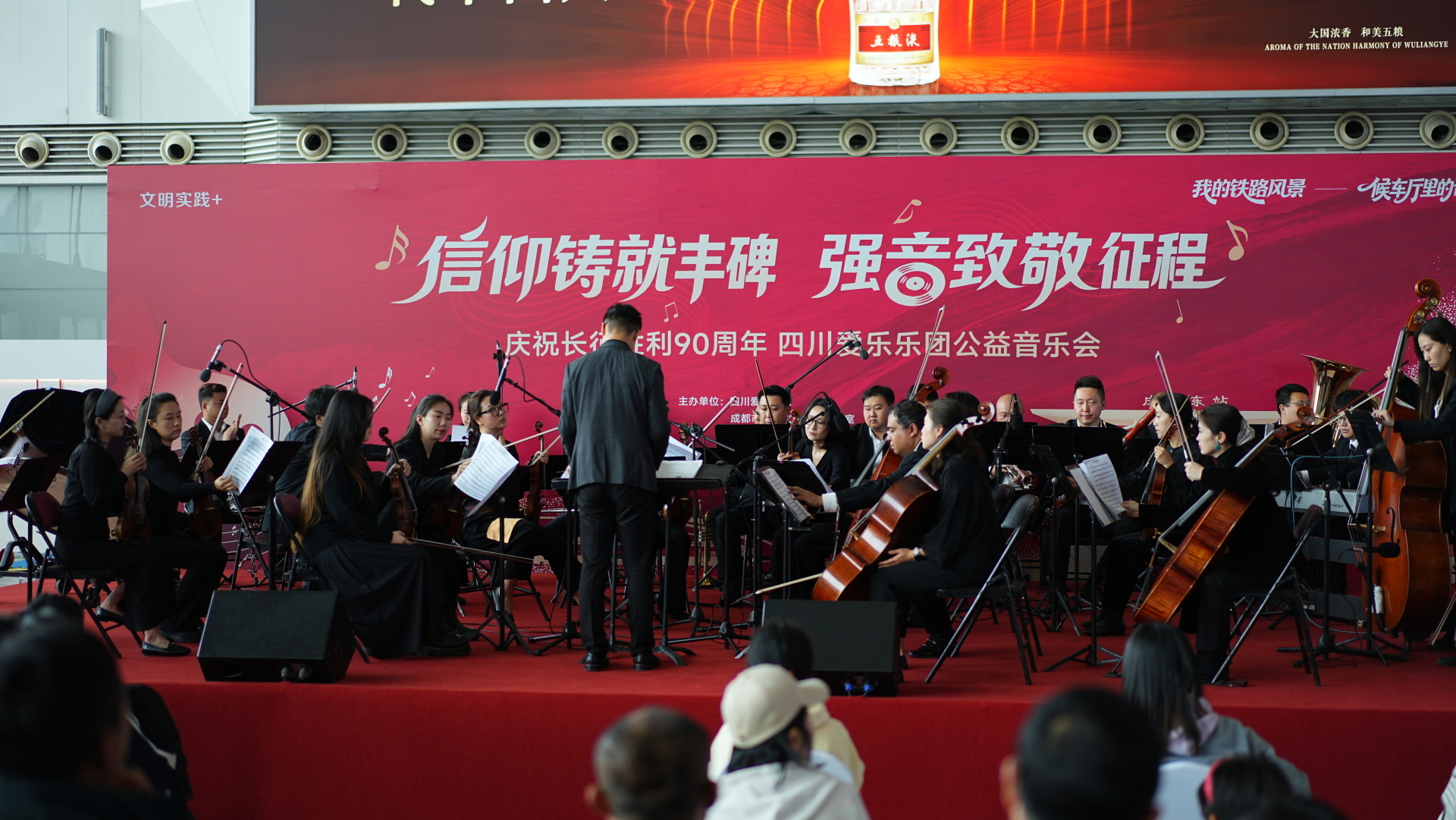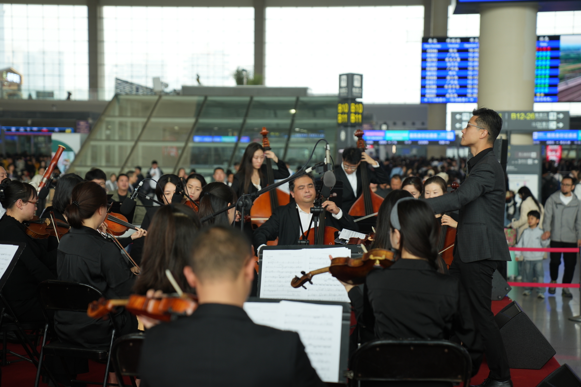 10点整,乐团指挥双手一挥,《红军战士想念毛泽东》的旋律随之响起,演出正式拉开帷幕。四川爱乐乐团倾情献演,为旅客带来极致的艺术享受。作为一支拥有三管编制的顶尖职业交响乐团,四川爱乐乐团始建于1973年。多年来,乐团始终坚守文化惠民的初心,曾为《神圣的使命》《焦裕禄》等数百部影视佳作录制配乐,举办过上千场音乐会,更远赴欧洲开展洲际巡演与国际艺术交流,用专业的演奏传递艺术力量,向世界讲述中国故事。