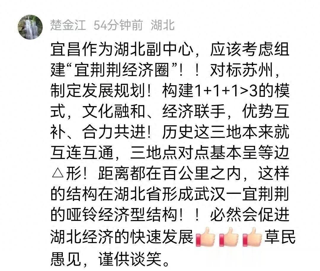 前段在头条号上写了篇《定了!荆州要搞到6000亿的》文章,反响十分热络,也收到许多网友评论留言与建议。其中一条建议让我第一时间给予了置顶:宜昌作为湖北副中心,应该考虑组建“宜荆荆经济圈”,对标苏州,制定发展规划,构建1+1+1>3的模式,文化融合、经济联手,优势互补、合力共进。