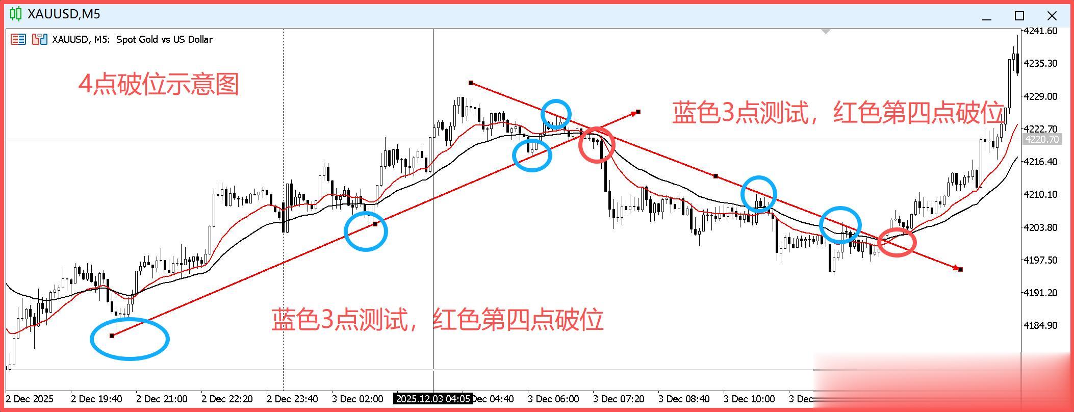 黄金5分钟的K线图,连续出现了两次4点破位的交易。