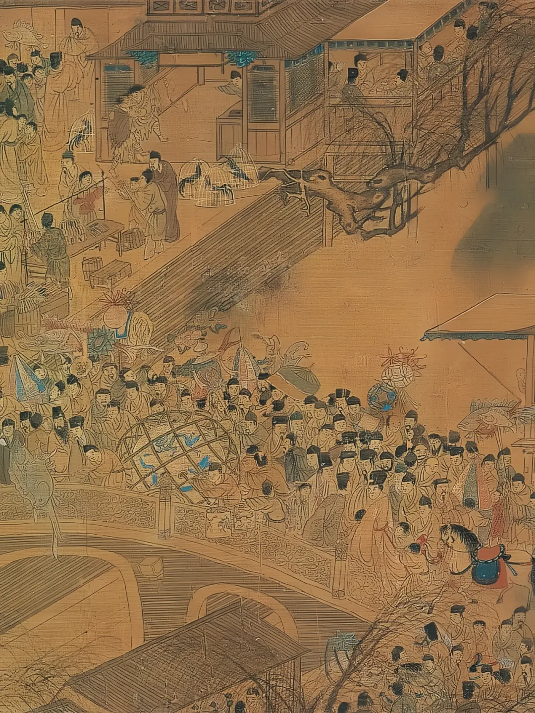 盛唐以生产力发达、社会富庶著称,作为国都的长安,是当时全世界首屈一指的大城市,人口在百万以上,过年期间的灯会自然也是盛况空前。每天夜晚,上至王公贵族,下至贩夫走卒,无不走出家门,欣赏争奇斗艳的各式花灯,甚至造成车无法掉头、人难以转身的严重“交通堵塞”。《唐两京新记》载:“正月十五日夜,敕金吾驰禁,前后各一日以看灯。”《雍洛灵异小录》则记下了“唐正月十五日夜……灯明如昼,山棚高百余尺,神龙以后,复加俨饰,士女无不夜游,车马塞路”的场景,极尽热闹繁华。